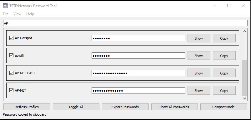Upon launching the TSTP: Network Password Tool, the application will automatically retrieve and display all saved Wi-Fi profiles on your system. Users can then view and manage these profiles through the intuitive GUI. Passwords can be displayed, copied, and exported with ease. The application also provides a detailed log of actions and errors to assist with troubleshooting and auditing.